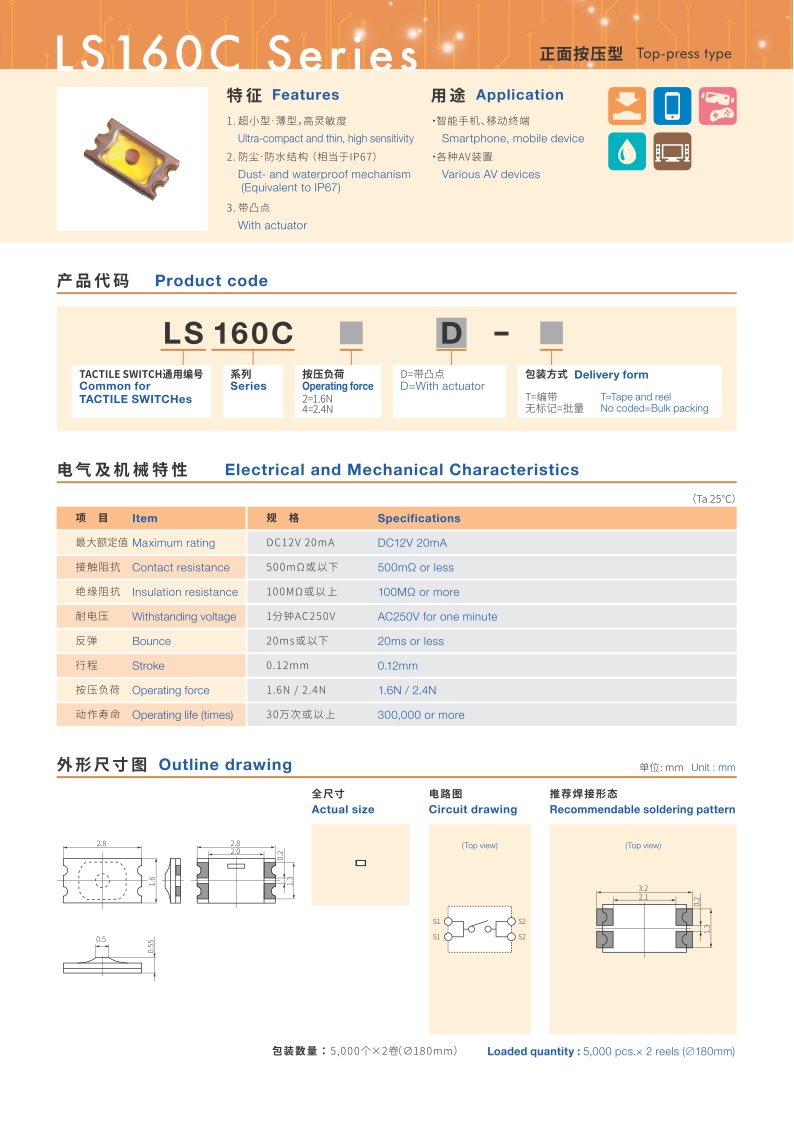 小型薄型,高靈敏度 防塵防水結(jié)構(gòu)(相當(dāng)于IP67) 帶/不帶凸點(diǎn) 2.30 x 2.80 x 0.60 mm Stroke : 0.15mm
