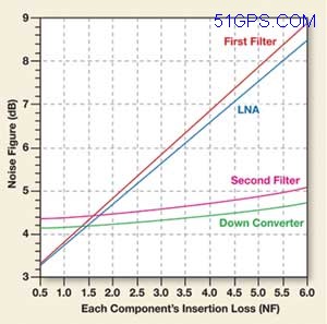 對于TM和S-GPS的工作,影響系統(tǒng)靈敏度的主要變量是第一級GPS濾波器的插損和低噪聲放大器的噪聲系數(shù),而第二級GPS濾波器的插損以及下變頻器的噪聲系數(shù)只有很小的影響。圖2中顯示了各個分立元件如何影響系統(tǒng)整體噪聲。